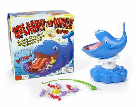 Splashy the Whale has all kinds of things in his mouth: anchors, fish bones, even a submarine. On your turn use the fishing rod to try to remove something...but watch out. He'll spray you with water if you touch his tongue or sometimes just when he feels like it. You won't get any points when that happens. At the end of the game, the player with the most points wins.For 2 or more players, ages 5 and up.Contents: 1 Splashy the Whatle, 12 assorted ocean pieces, 1 fishing rod and rules.Requires 3 AA batteries; not included.