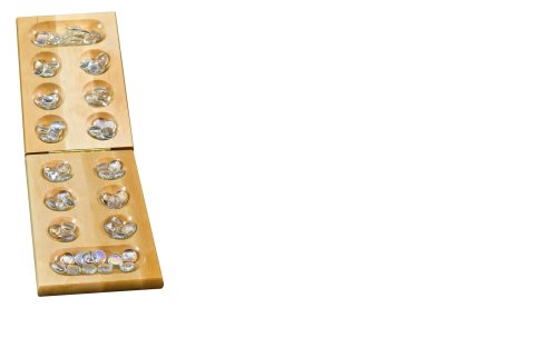 The goal of each player is to collect the glass beads in his or her mancala (the big cups at each end of the game board). Begin your game by filling each cup (except mancalas) with 4 beads. A player then picks up beads from a cup and redistributes them, one at a time, into other cups around the board. A few simple rules govern which cups a player can drop a bead into and when a player's turn is over. Collect the most beads in your mancala to win the game! Then, fold the glass beads inside the game board and slip the board into a convenient storage box. Beads won't get lost! Oak-finish, hinged game board unfolds to 5-1/4x17-3/4. Includes 48 clear glass beads and instructions for basic game. For 2 players.